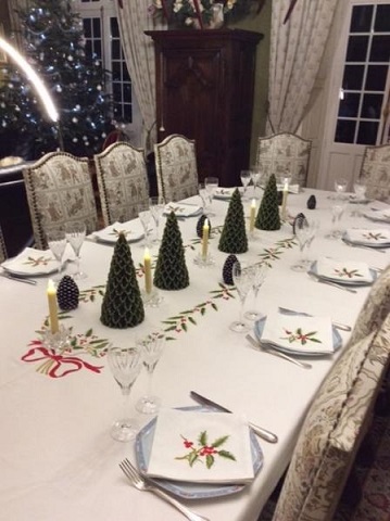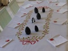 Nappe de Noël brodée d’une grande guirlande de feuilles de houx et d’un noeud rouge à chaque extrémité.