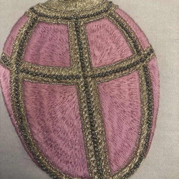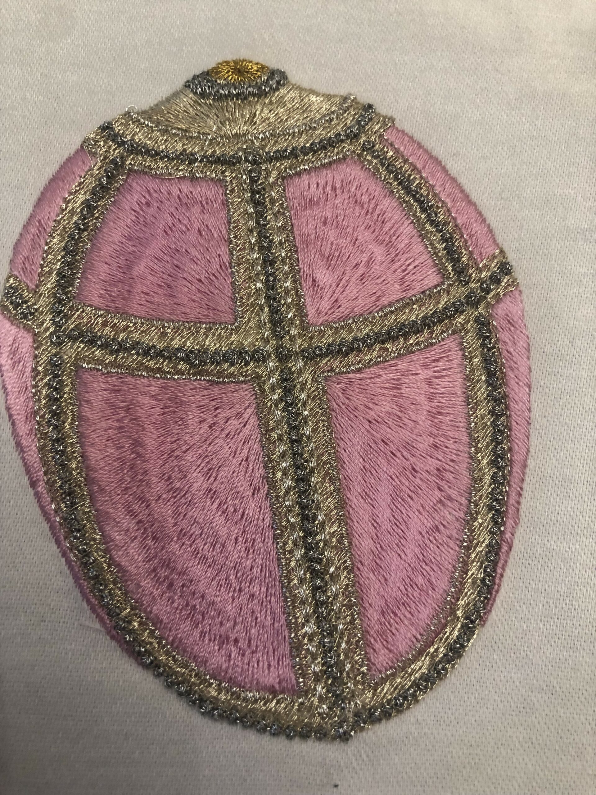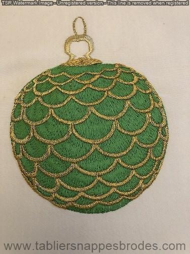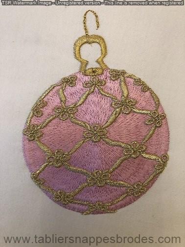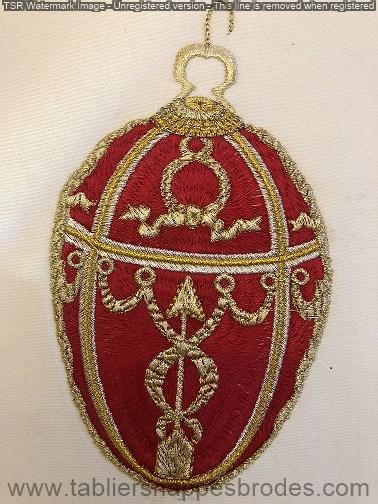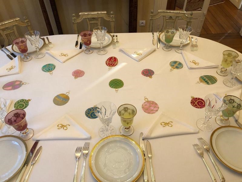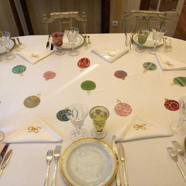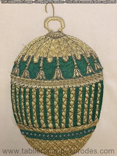 Les oeufs Fabergé ont été modifiés pour réaliser des boules de Noël à broder sur une nappe blanche pour les fêtes de Noël