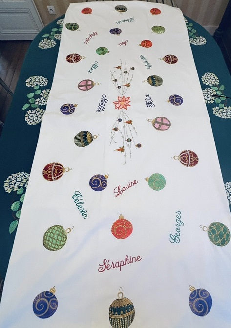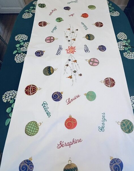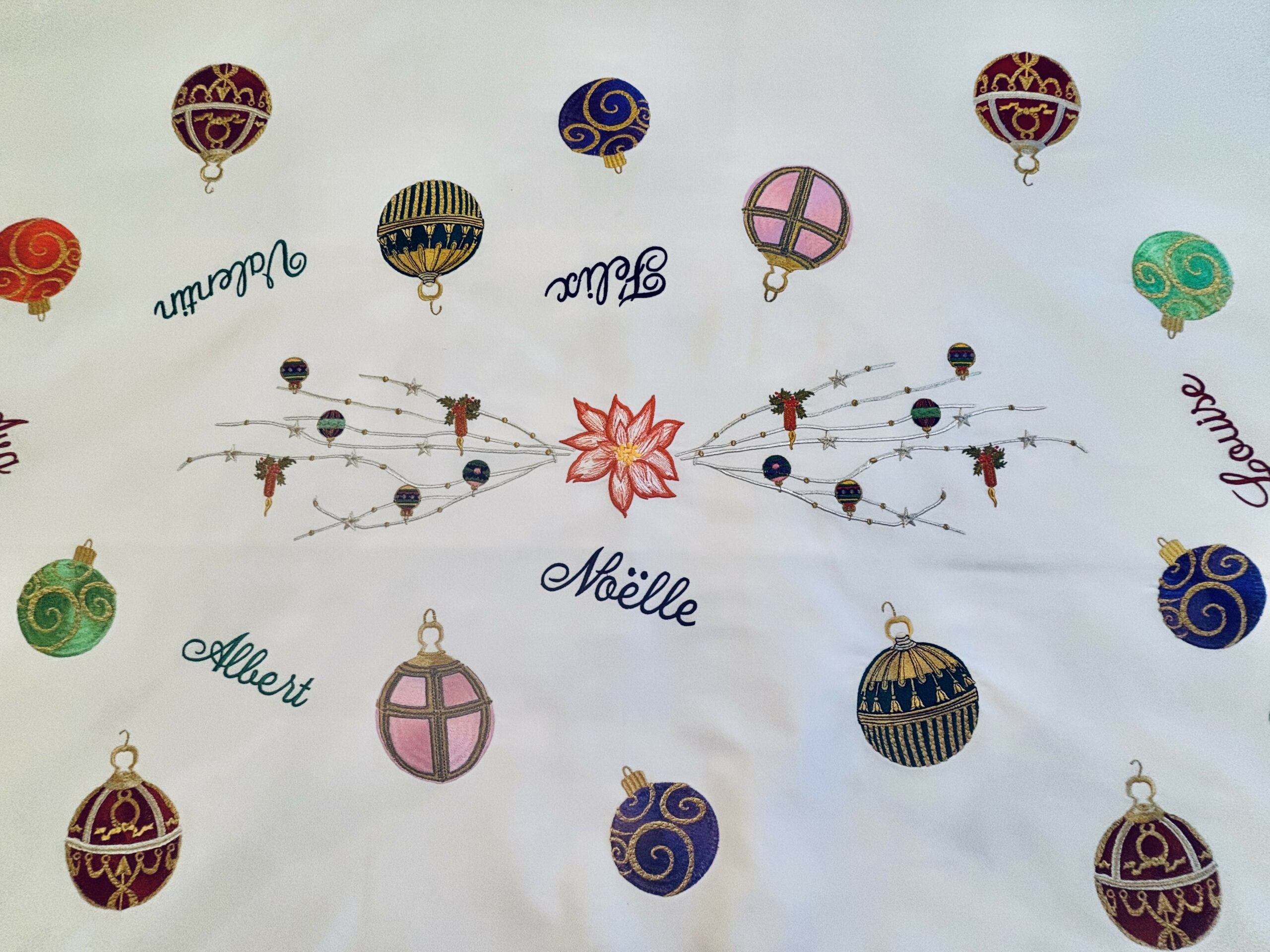 Nappe blanche brodée de boules de Noël avec tout autour les prénoms de la famille et au centre des branches décorées.