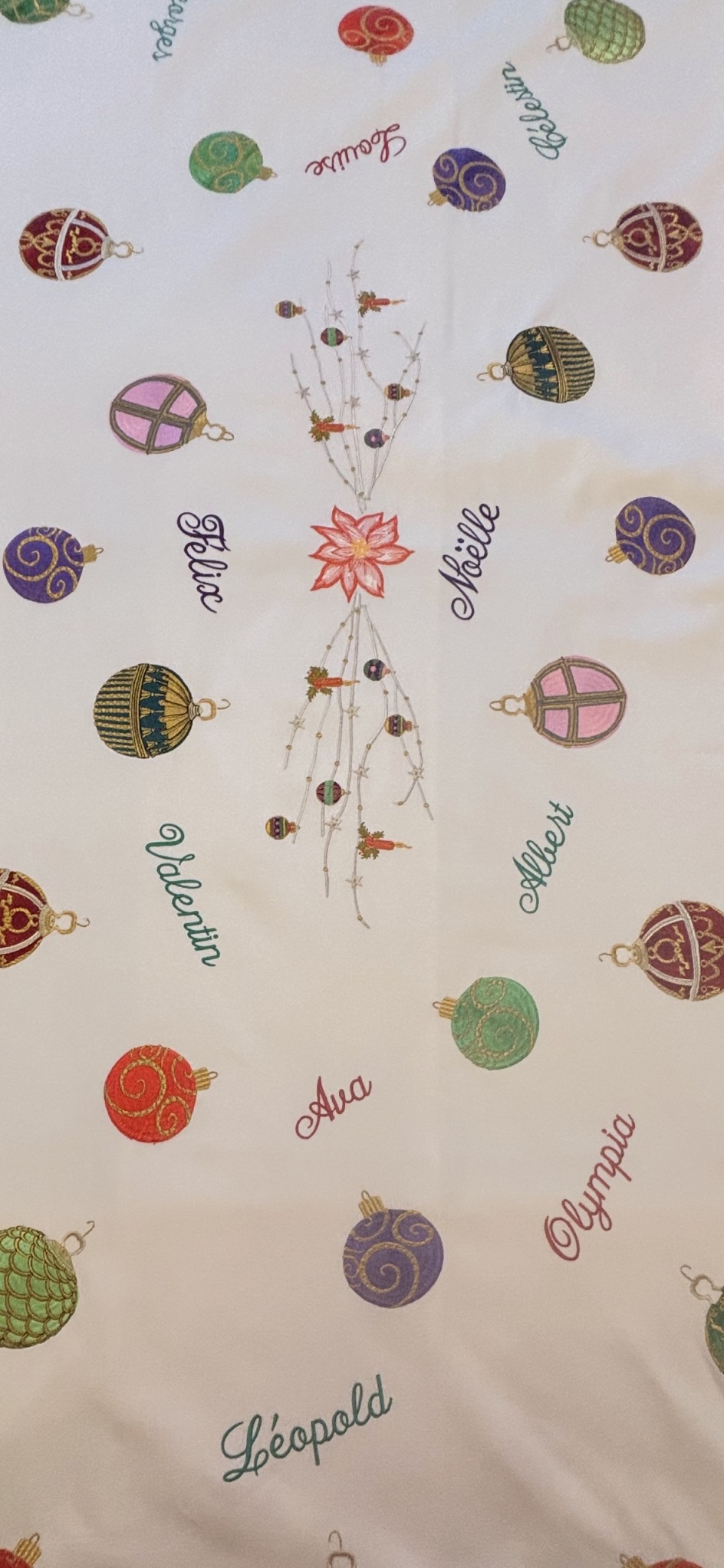 Grande nappe blanche brodée de multiples boules de Noël de toutes les couleurs avec au centre un bouquet de branches argentées et les prénoms de la famille dissiminés autour du bouquet central et des boules de Noël.