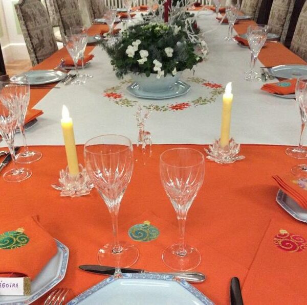 Association d’une nappe orange brodée de boules de noël et d’un chemin de table blanc brodé de couronnes de fleurs de Noël