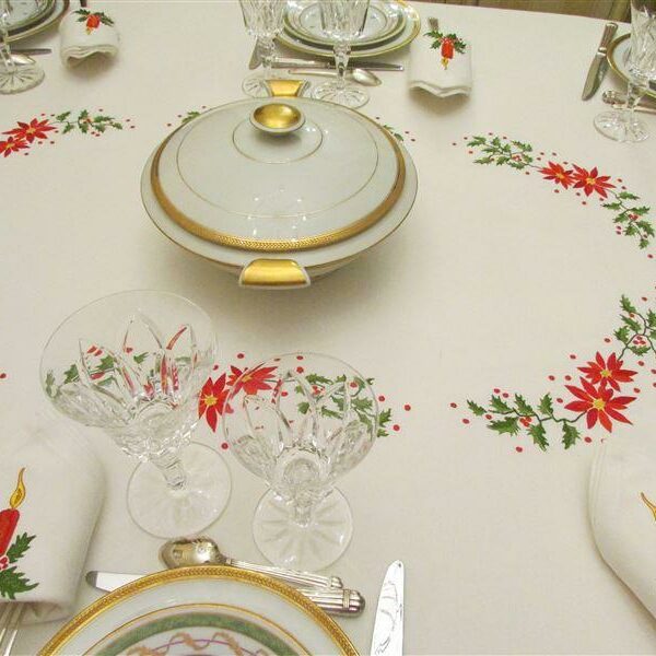 Nappe de grande taille brodée de boules de Noël, associée à un chemin de table blanc brodé de couronnes de fleurs de Noël oranges