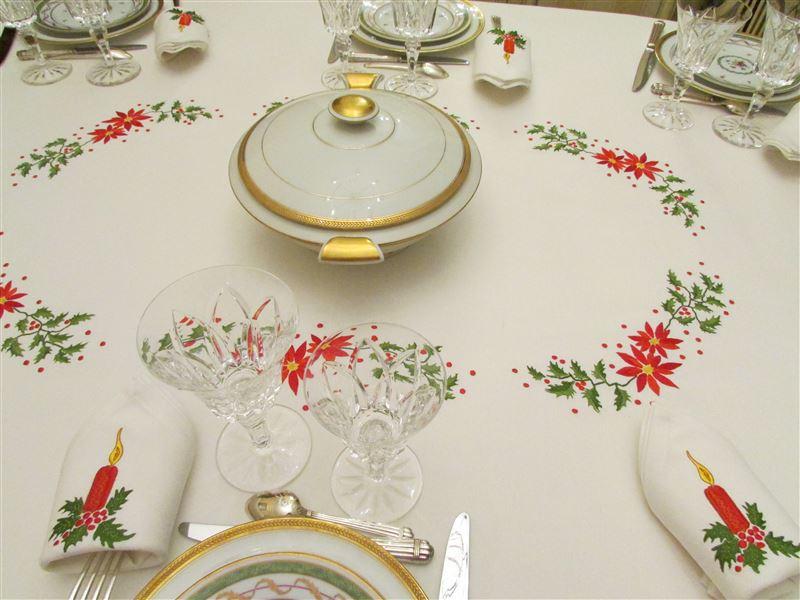 Nappe de grande taille brodée de boules de noël, associée à un chemin de table blanc brodé de couronnes de fleurs de noël oranges