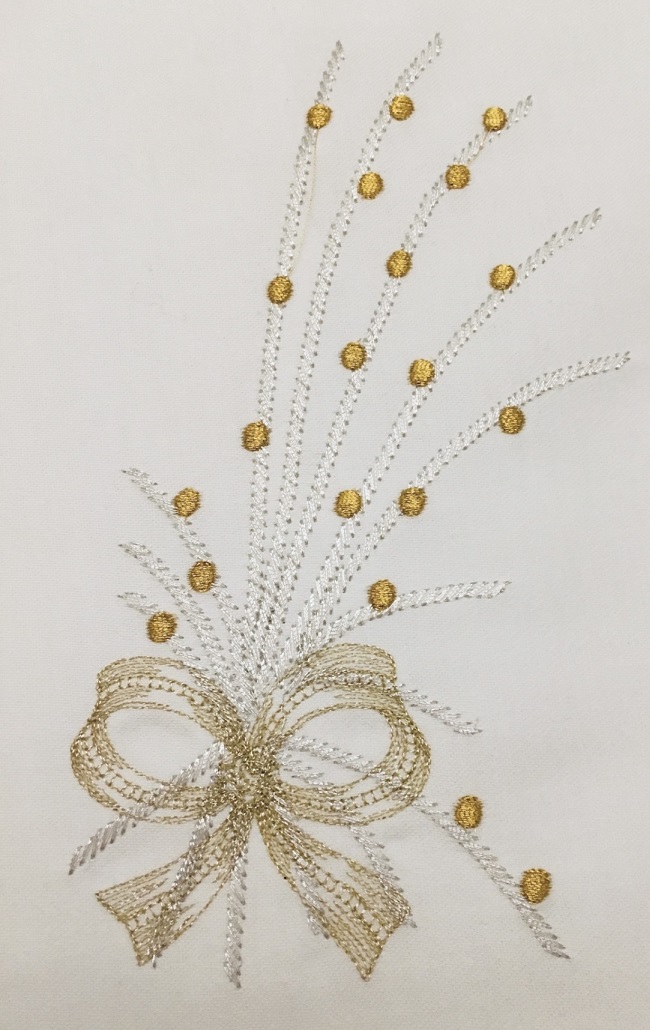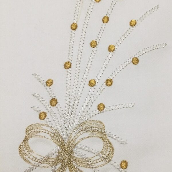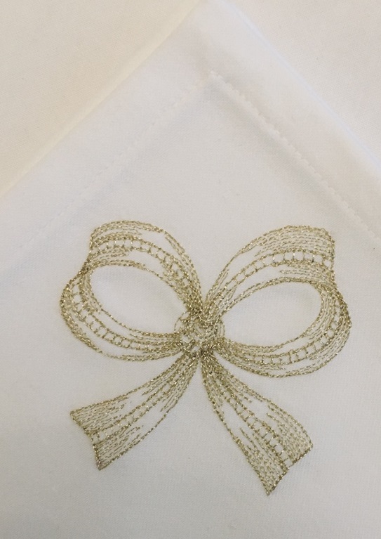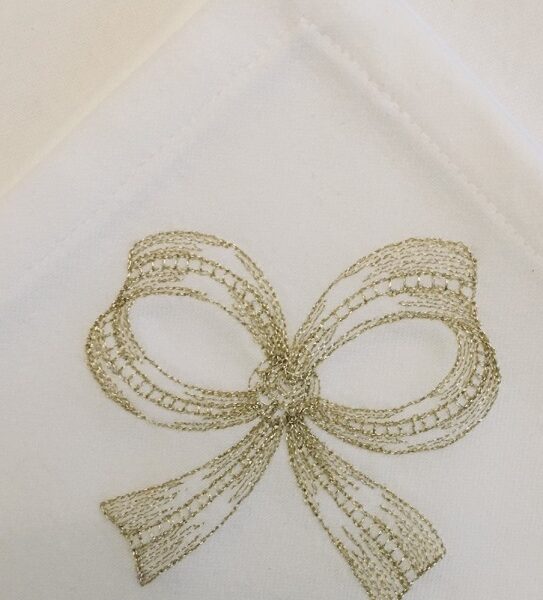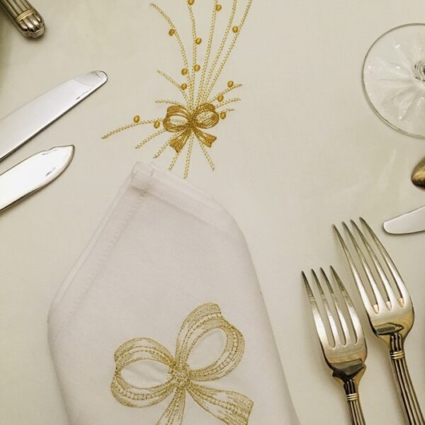 Noeuds et joncs brodés sur des sets de table en lin blanc, brodés de fils d’or