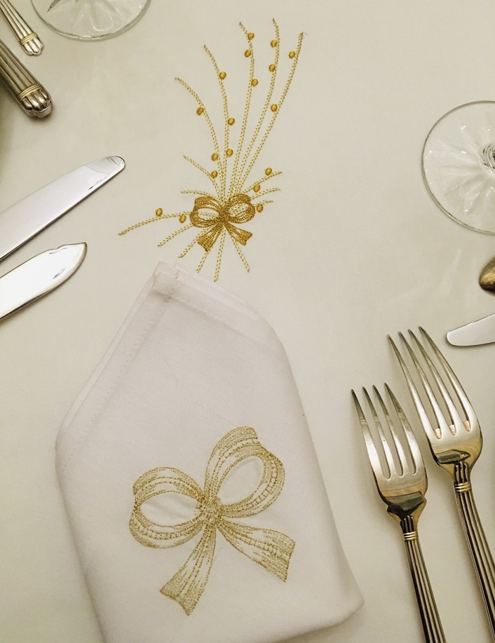 Beaucoup d’élégance et de simplicité sur cette table de fête dressée avec des sets en lin blancs brodés de fils d’or