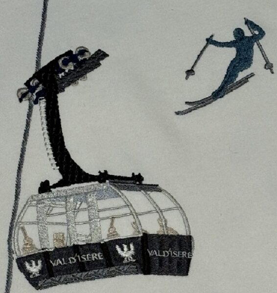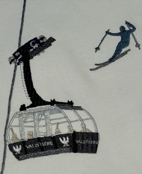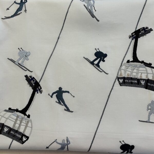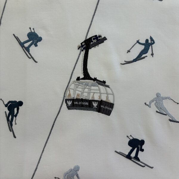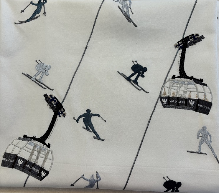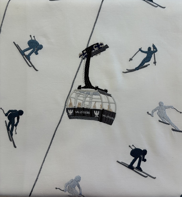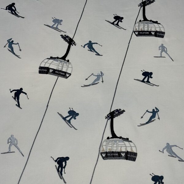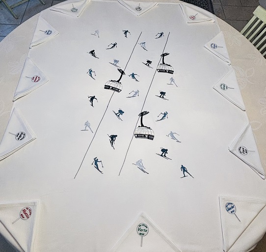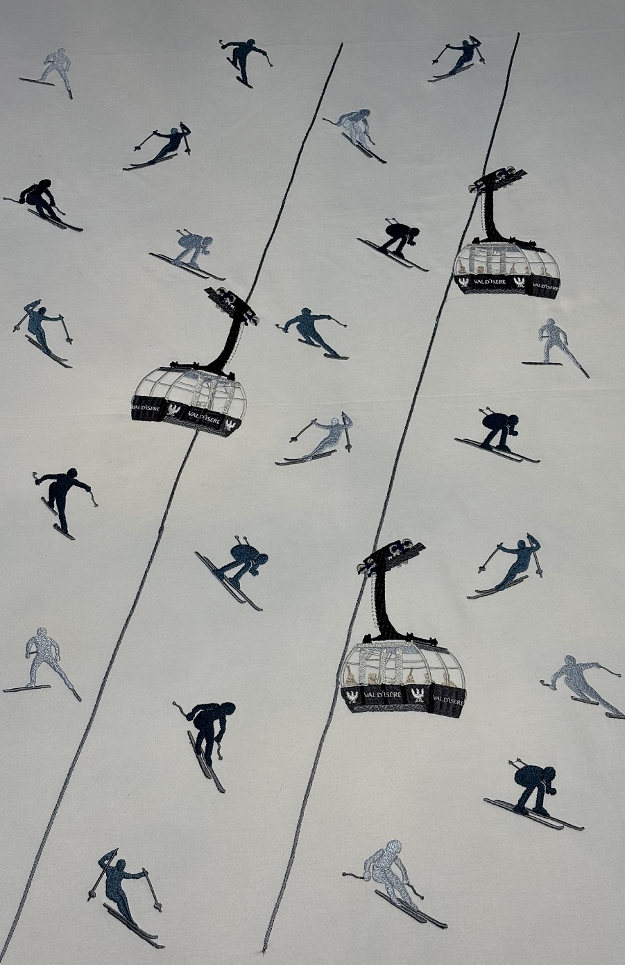 Nappe blanche brodée de silhouettes de skieurs descendant une piste de Val D’Isère sous les télécabines. Les serviettes sont brodées aux noms de certaines pistes : noire, rouge,bleue et verte …